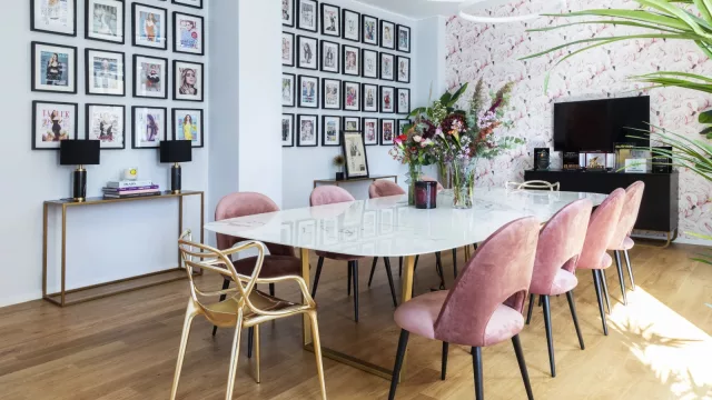 Al entrar, fui recibida por Chiara con una sonrisa cálida y una energía que llenó la sala. Su oficina, llena de recuerdos de su increíble carrera, parecía un santuario donde la moda y la innovación digital se encuentran. Nos sentamos junto a dos personas de su equipo en la sala de reuniones, la cual llaman por su nombre “Chiara”, la pared estaba completa por marcos de cada tapa de revista que supo ser protagonista, el tiempo corría y la charla prometía inspiración.
