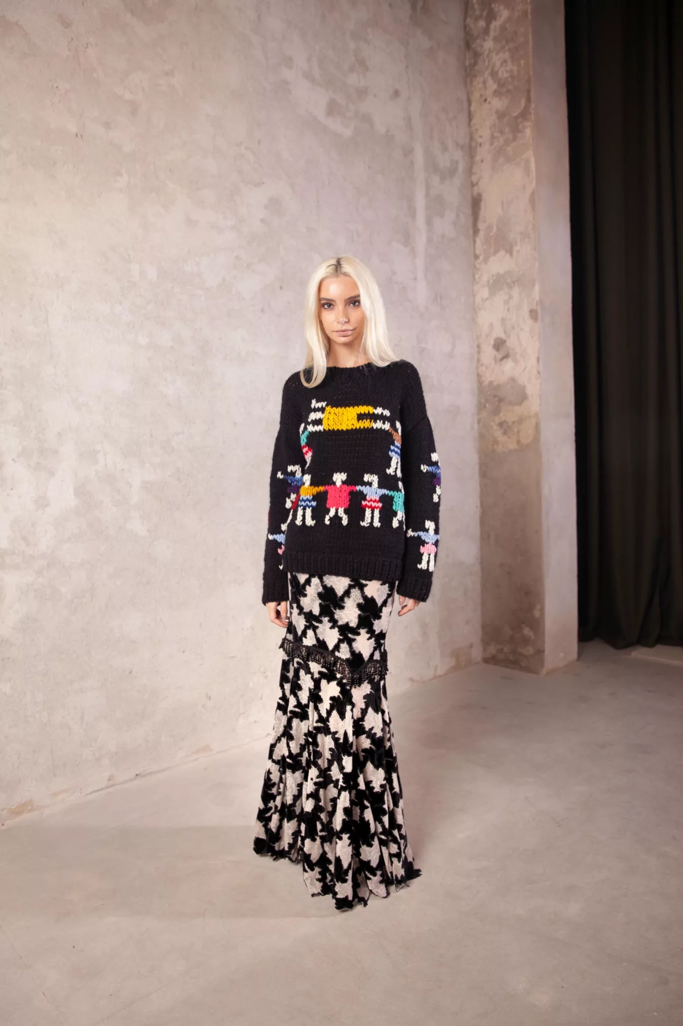 Chiara: En 2019 tenía el deseo de desarrollar una colección de vestidos, sweaters y faldas con flecos que reinterpretara un material tradicionalmente asociado a lo cotidiano, elevándolo a una propuesta más sofisticada. Tenía muy clara la idea y los diseños, pero no contaba con experiencia en tejido de punto. Una amiga sugirió que contactara a Sol y a su mamá Silvia, quien tenía experiencia —y son una familia profundamente vinculada al trabajo con estas fibras—. Les presenté la propuesta y, casi de inmediato, surgió el interés por sumarse al proyecto. Sin duda, fue un verdadero acierto.
