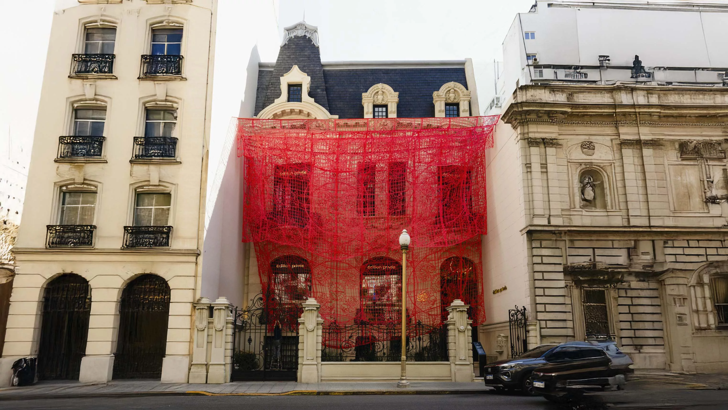 Manuel Ameztoy realizó una intervención textil de sitio específico tanto en la fachada como en los espacios interiores de édition privée. Esta intervención artística se propone continuar la gramática ornamental propia del edificio desde una mirada contemporánea, disruptiva y festiva. La intervención textil funciona como un desborde ornamental que comienza en el corazón del edificio -su gran lucarna interior- y se derrama en dos grandes cascadas textiles que caen profusa y livianamente desde diez metros de altura hasta casi tocar los pisos de cedro y roble, poblando los espacios aéreos del gran hall central con un delicado patrón vegetal que reproduce el de los vitrales. Las piezas textiles de colores rojo, coral y natural están realizadas en no-tejido calado a mano y cosido en múltiples paños superpuestos.