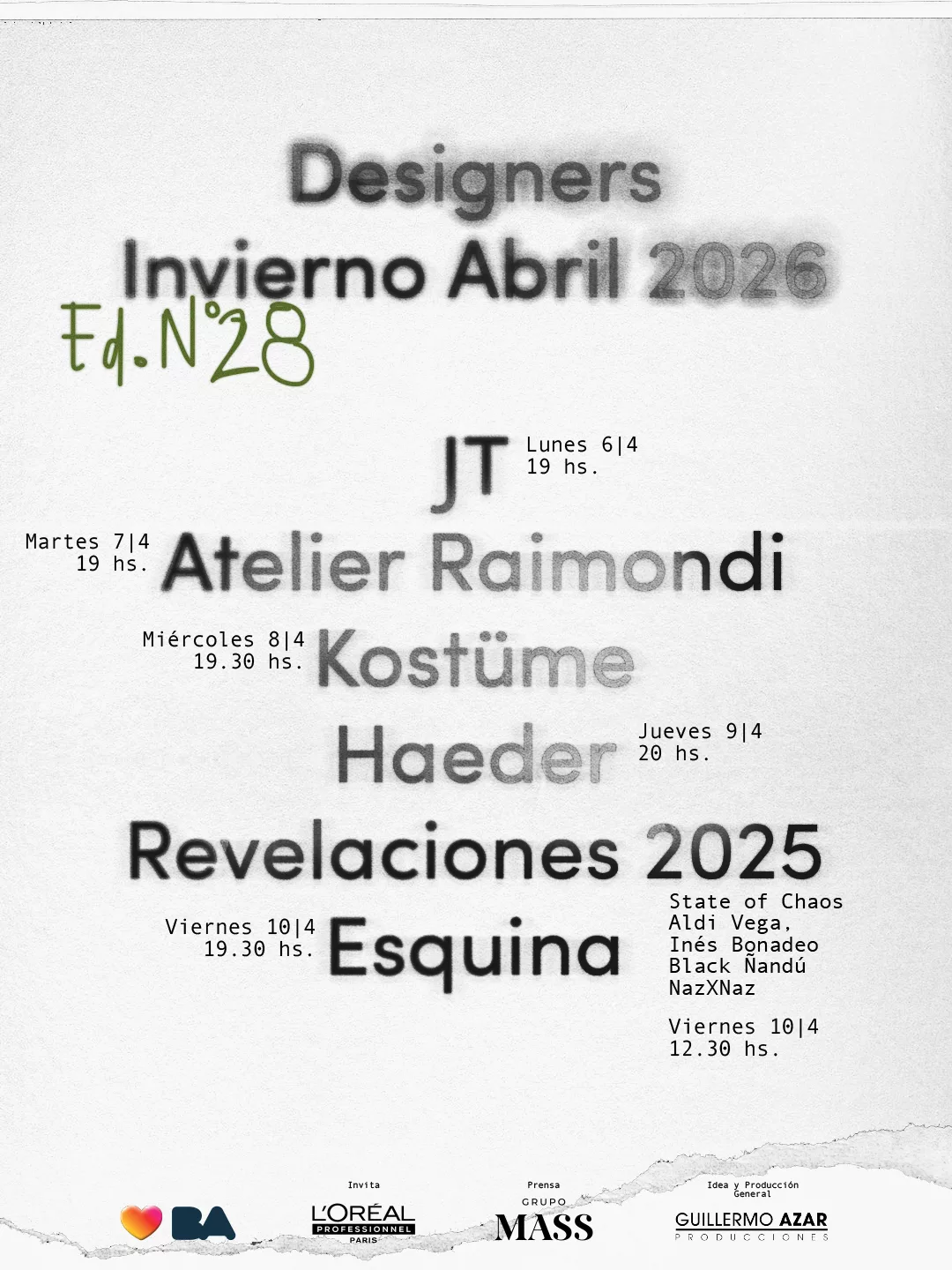 El cierre, el viernes 10 de abril, será doble y especialmente significativo. A las 12:30 hs, Revelaciones 2025 pondrá el foco en las nuevas voces con nombres como State of Chaos, Aldi Vega, Inés Bonadeo, Black Ñandú y Naz x Naz. Una plataforma que no solo exhibe talento emergente, sino que también anticipa hacia dónde se dirige la moda. Más tarde, a las 19:30 hs, Esquina en Deseo cerrará la semana con una propuesta que promete intensidad estética y sensibilidad urbana.