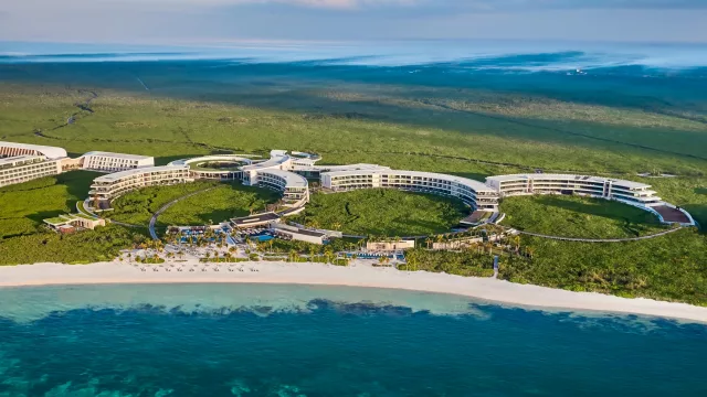 ¿Qué lo hace único? Todo. La arquitectura futurista que flota sobre un manglar, las terrazas privadas con vistas infinitas, las múltiples piscinas, y hasta un calendario maya reinterpretado en cada rincón de su decoración.